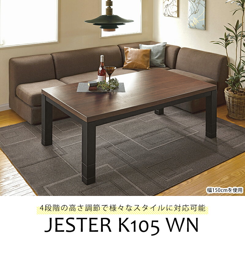 メーカー希望小売価格はメーカーカタログに基づいて掲載しています リビングコタツ ジェスタK105WN 4段階に高さ調節でき様々なスタイルに対応可能■ 2段階継脚(高さ4段階調節可)■ 天板側面ウォールナット材面貼り■ 天板固定ネジ付■ コード収納ボックス付 商品名 リビングコタツ ジェスタK105WN サイズ (約)幅105×奥行75×高さ(37・42・47・52)cm 素 材 天板:ウォールナット突板/塗装:ウレタン樹脂塗装(UV加工)/ ヒーター:NN-8800TM カーボンヒーター(手元電子コントローラー) 配送について ※こちらの商品はメーカー直送の為、代引でのお取扱いができません。