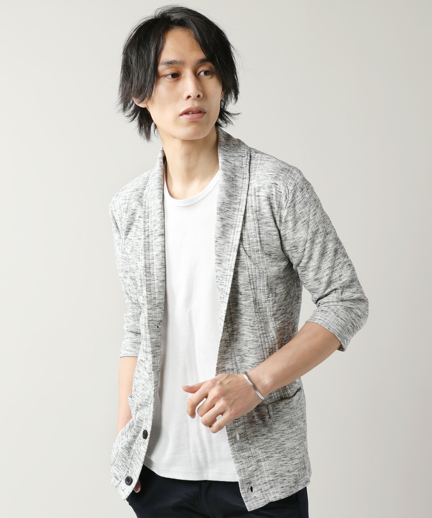 SPU/ランダムテレコショール7分袖カーディガン ●ショールカラーで魅せる大人のリラックスカーディガン 表面の畦が裏表に互い違いに出るランダムテレコ生地を採用した本アイテム。