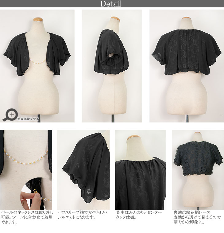 胸元のパールチェーンが煌めくボリューミーなパーティーボレロです。