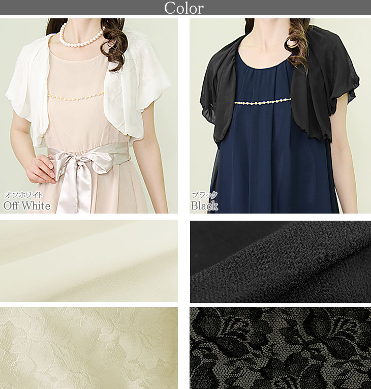 【サイズ】7号/9号/11号/13号 【カラー】オフホワイト/ブラック 【トップス分類】[パーティーボレロ・カーディガン] ▼胸元のパールチェーンが煌めくボリューミーなパーティーボレロです。